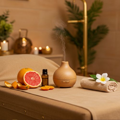 🎯 Diseña un servicio “Piernas Ligeras” con aceite base + toronja + gel criogénico.