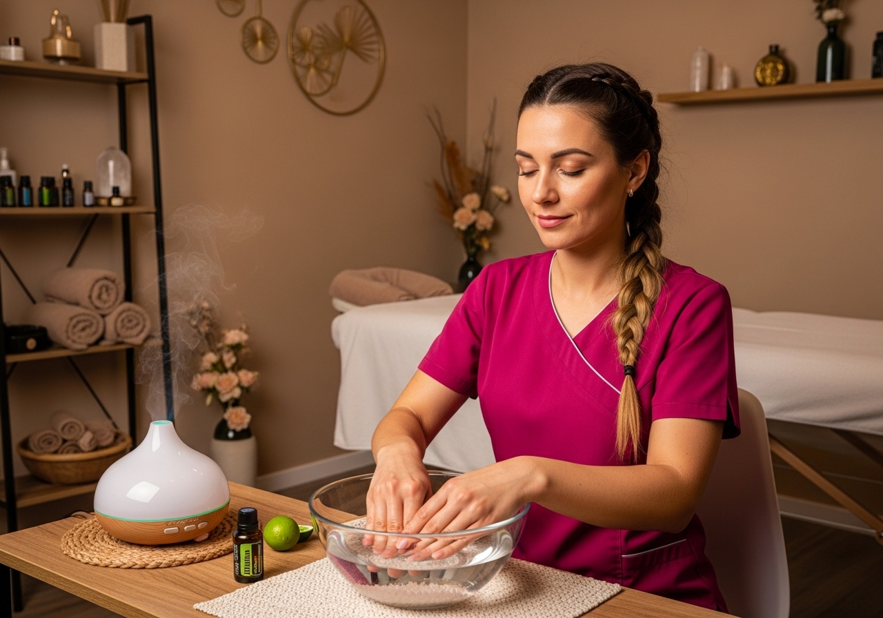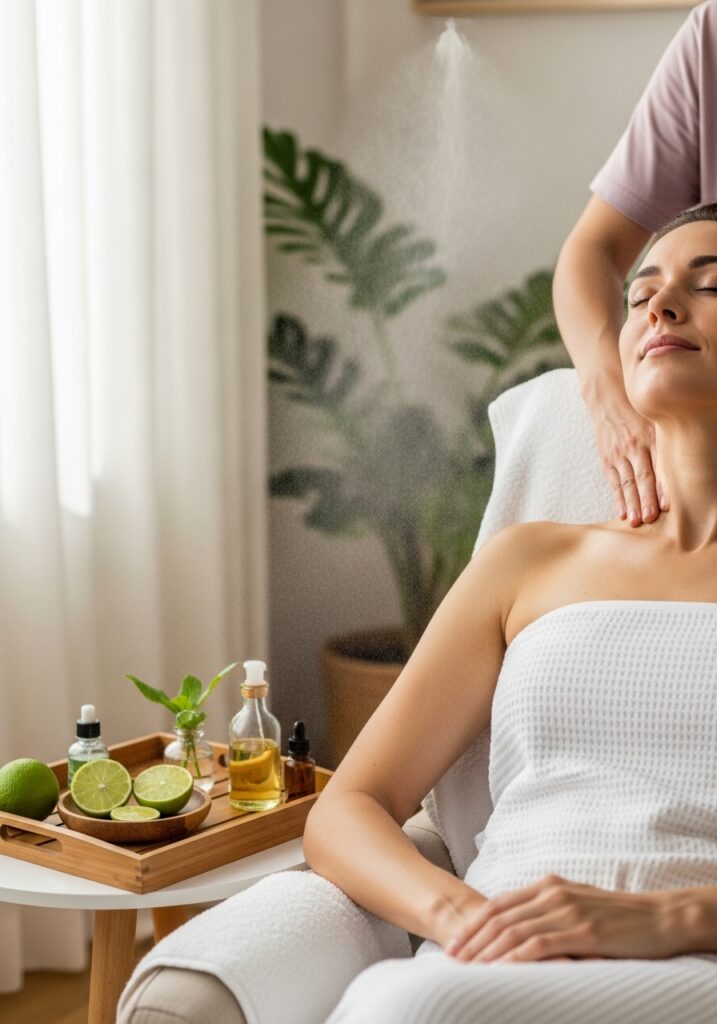 🔸 Masaje Holístico con enfoque en trapecios, cuello y cuero cabelludo:  Agrega aceite esencial de lima en difusión o combinado con menta para efecto revitalizante.